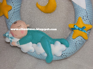 Hoje podemos mostrar um miminho para bebé, uma coroa em esferovite forrada a tecido com aplicação de bebé, estrelas, lua e nome em feltro.
