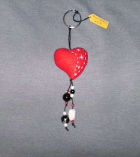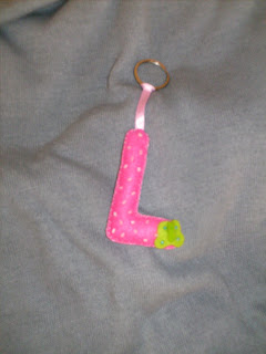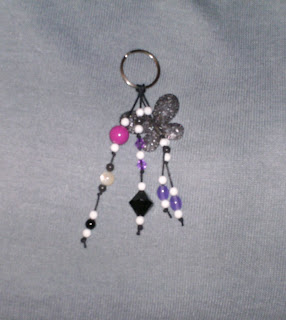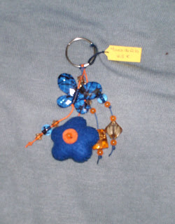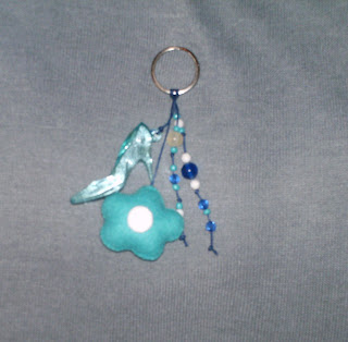 Porta-chaves com flor em feltro roxo, prespontado a verde e com missangas verdes. O resto das aplicações são em tons de verde e roxo. Também foi por encomenda.