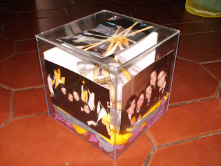 Com umas caixas transparentes que depois de servirem para decorar lojas e que iam para o lixo, resolvi aproveita-las. Como tinha umas fotos que ainda não tinha exposto, relacionadas com o último ano de universidade, dispus as fotos pelas faces do cubo e enchi-o com as fitas do último ano para que as possa ver sempre. Aqui fica a foto como prometi à Patrícia. Obrigada Ana, Lipa e Tixa por todos os bons momentos que passámos juntas.