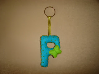 Porta-chaves com a letra P em azul turquesa com borboleta verde e prespontos verdes.